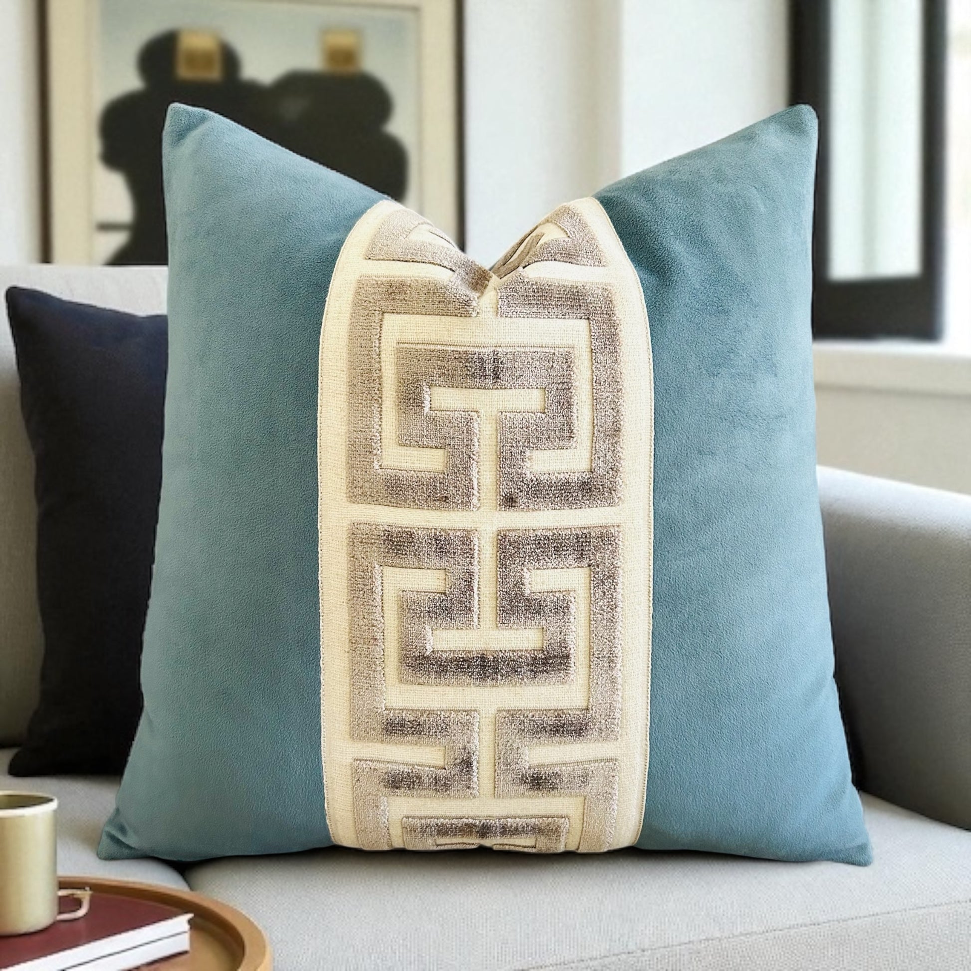 Azure Blue Velvet Pillow Cover with Greek Key Trim